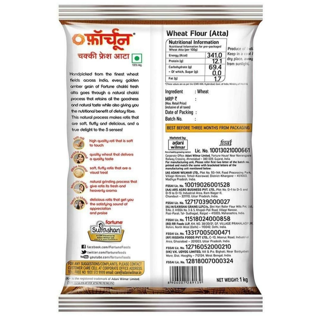 Handpicked from the finest wheat fields across India, every golden amber grain of wheat used for Fortune chakki fresh atta goes through a traditional chakki process that retains all the goodness and natural taste while also giving you the nutritional benefits of dietary fibre. This natural process makes sure that your rotis stay soft and fluffy for long.Handpicked from the finest wheat fields across India, every golden amber grain of wheat used for Fortune chakki fresh atta goes through a traditional chakki process that retains all the goodness and natural taste while also giving you the nutritional benefits of dietary fibre. This natural process makes sure that your rotis stay soft and fluffy for long.